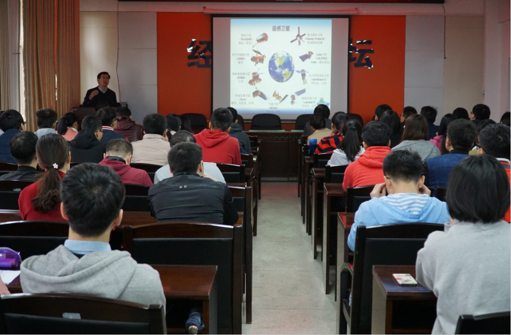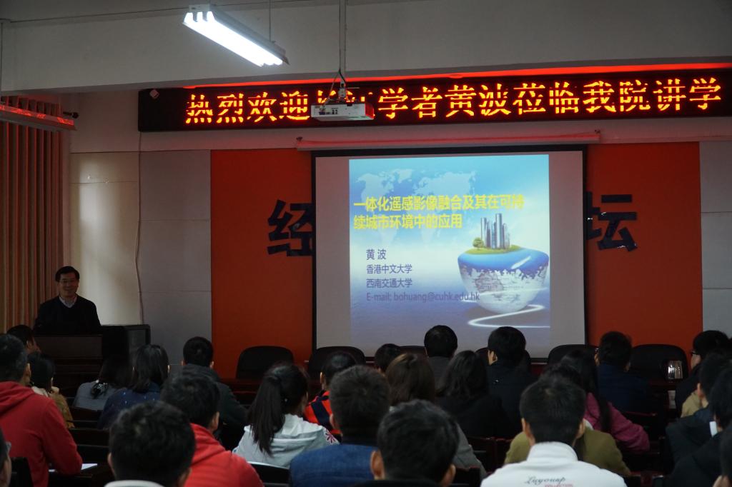 黄波针对卫星遥感系统的分辨率制衡问题,介绍了他提出的全属性(时-空-谱-多角度)一体化遥感影像融合方案,以较低成本解决了遥感影像分辨率问题,并将成果应用于土地覆盖分类、PM2.5环境监测、城市扩展的土地变化建模,服务于可持续的城市规划和空间优化问题。报告会后,遥感系教师就研究方向、遥感教学等与黄波进行了交流,员工向黄波咨询了融合方法具体实现需要注意的问题,以及到香港中文大学攻读硕士研究生等相关问题。