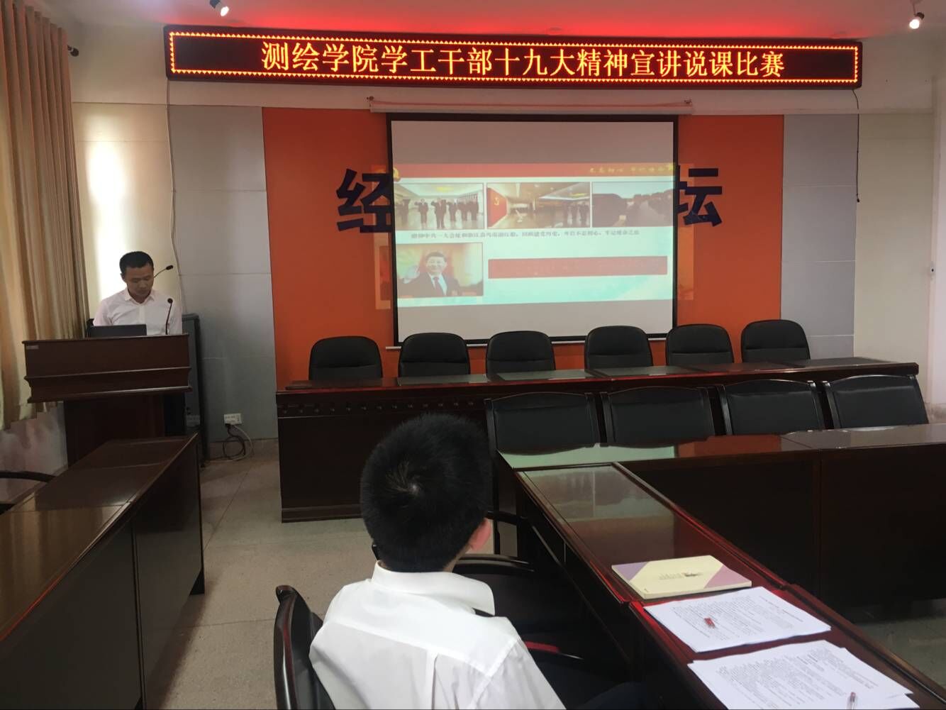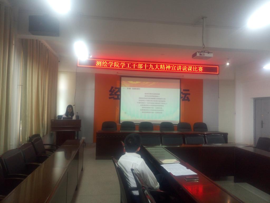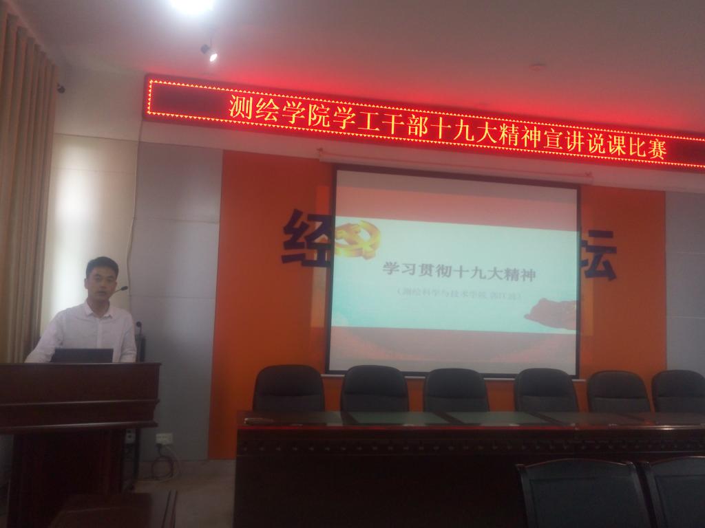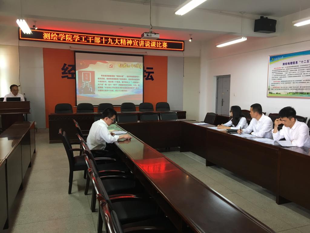 各学工干部以说课的形式,围绕十九大精神主题,通过PPT讲稿、视频等方式,详细阐述十九大应知应会及深刻含义,在宣讲十九大精神的同时结合自身工作实际,切实、生动、活泼的宣传十九大精神。比赛最后,副书记费秀水就每个人的优点及存在的不足提出了意见和建议。
