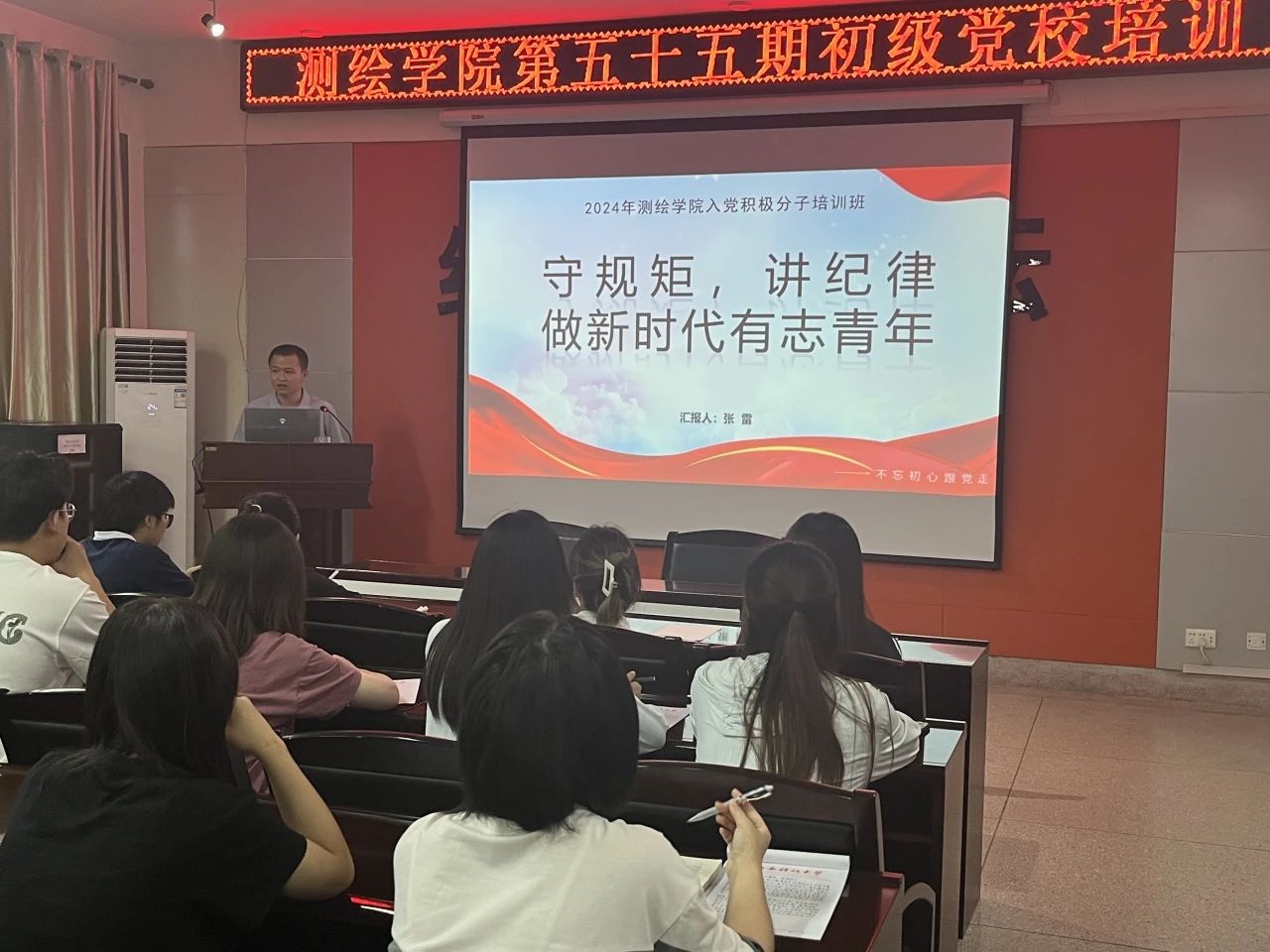 主讲人张雷老师首先提醒同学们要在思想上重视起来,充分认识这次入党积极分子专题培训的重要意义,并介绍了成为一名共产党员的基本条件与入党流程。