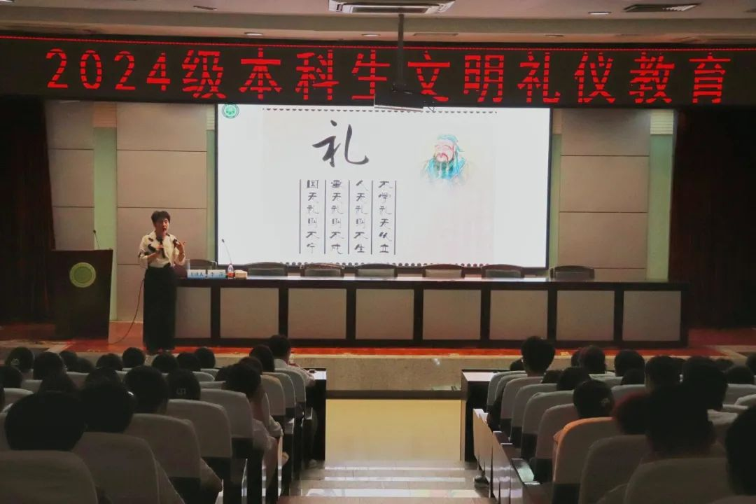 为了规范2024级本科生文明礼仪,帮助同学们更好的处理学习生活中的相关问题。2024年9月22日由党委学工部、云顶国际8588yd联合举办的2024级本科生文明礼仪教育课程在图书馆二楼报告厅开讲。本次课程由李萍主讲,2024级辅导员刘钊主持,2024级全体员工参与。