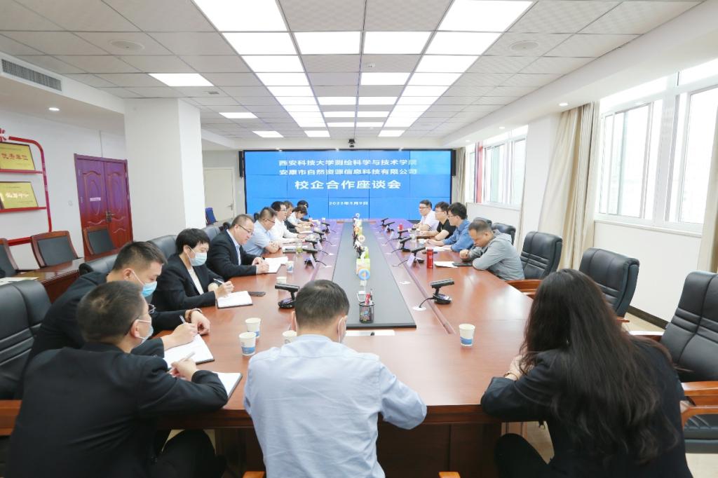 揭牌仪式后,双方举行了校企合作座谈会。座谈会上,双方在科研合作、科技创新、人才培养、科技成果应用等方面开展了深入交流。公司副经理(主持行政工作)李朋飞对公司科研情况等做了详细介绍,认为双方在科技合作方面具有广阔空间,尤其是在科技成果转化方面,双方互补优势明显。安康市自然资源信息科技有限公司董事长刘洪波表达了对实现“校企合作、产学共赢”的殷切期望。