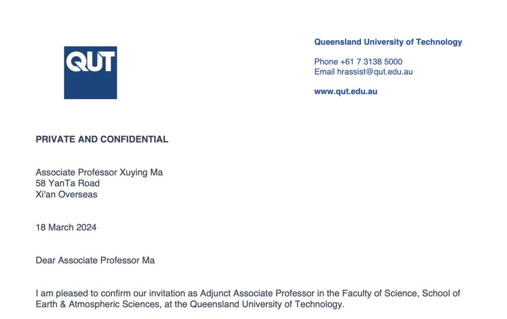 近日,据澳大利亚昆士兰科技大学(Queensland University of Technology)人力资源部官方通知,经过澳大利亚科公司院士Lidia Morawska教授推荐和昆士兰科技大学学术委员会评审,2024年3月18日云顶国际8588yd地信系教师马绪瀛获聘昆士兰科技大学客座副教授(Adjunct Associate Professor)、兼职博/硕士生导师,成为公司首位获聘昆士兰科技大学的客座专家。