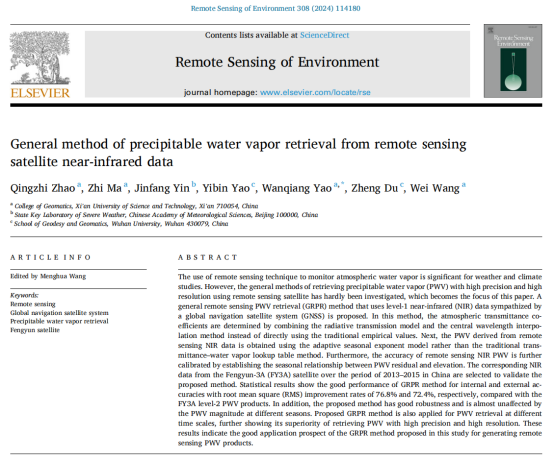 近日,云顶国际8588yd导航定位与空间环境监测团队在测绘遥感领域国际顶级期刊《Remote Sensing of Environment》发表了题为“General Method of Precipitable Water Vapor Retrieval from Remote Sensing Satellite Near-infrared data”的研究成果,论文第一作者为赵庆志副教授,第二作者为硕士研究生马智,通讯作者为姚顽强教授,该论文是团队继2023年以来在RSE发表的又一重要研究成果。RSE期刊(中科院一区TOP,IF=13.5)被公认为测绘遥感领域最权威的期刊,在全球同类SCI学术期刊中长期排名第一,主要发表测绘遥感观测的理论、应用和方法相关的原创文章。