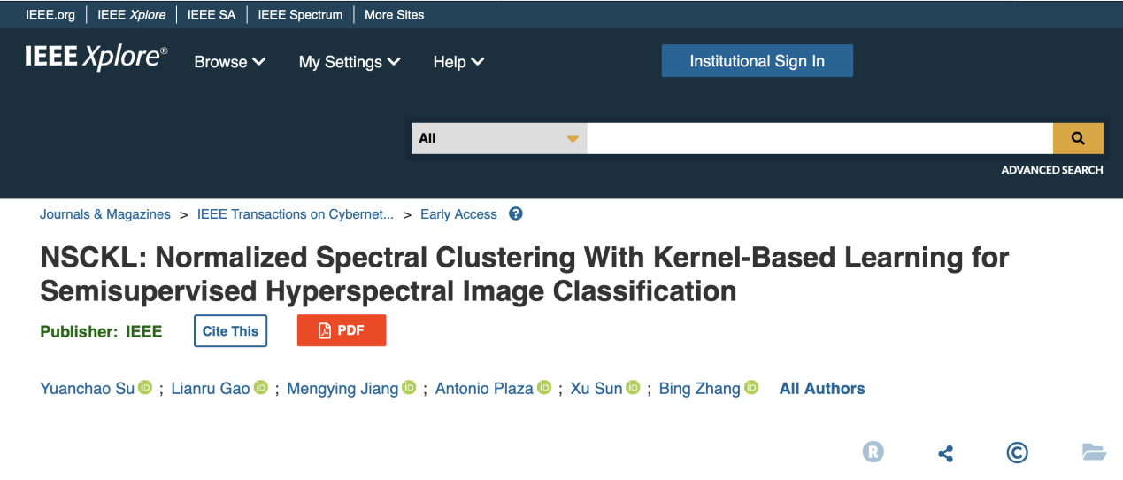 近日,云顶国际8588yd、中国科公司空天信息研究院和埃斯特雷马杜拉大学(西班牙)联合在IEEE Transactions on Cybernetics (IEEE TCYB)发表了题为“NSCKL: Normalized Spectral Clustering With Kernel-Based Learning for Semisupervised Hyperspectral Image Classification”的研究论文。公司遥感系苏远超老师为该论文第一作者,这是云顶国际8588yd首次以第一作者和第一完成单位在IEEE TCYB上发表的学术论文。
