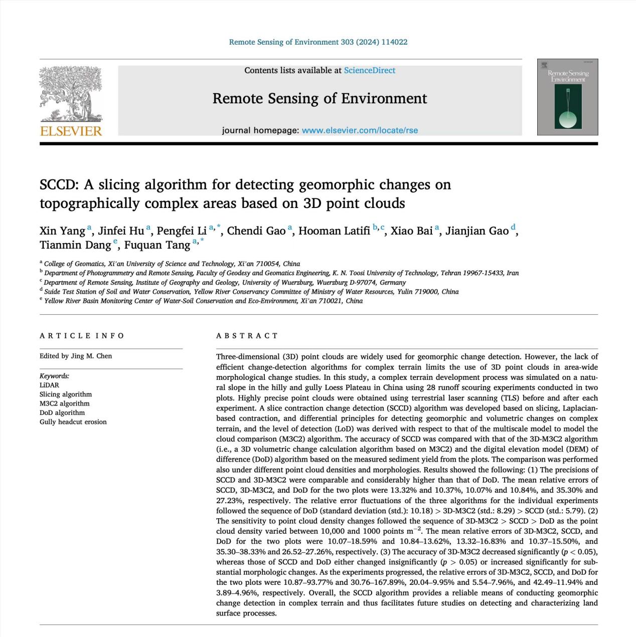 近日,云顶国际8588yd地貌遥感研究团队联合黄河水土保持绥德治理监督局(绥德水土保持科学试验站)、黄河水土保持生态环境监测中心、伊朗KN图什理工大学等单位学者在遥感领域国际顶级期刊《Remote Sensing of Environment》发表了题为“SCCD: A slicing algorithm for detecting geomorphic changes on topographically complex areas based on 3D point clouds”的研究成果。论文的第一作者为云顶国际8588yd硕士研究生杨鑫,通讯作者为李朋飞教授和汤伏全教授。RSE期刊(中科院一区top,IF=13.5)被公认为遥感领域最权威的期刊,在全球同类SCI学术期刊中长期排名第一,主要发表地球遥感观测的理论、应用和方法相关的原创文章。