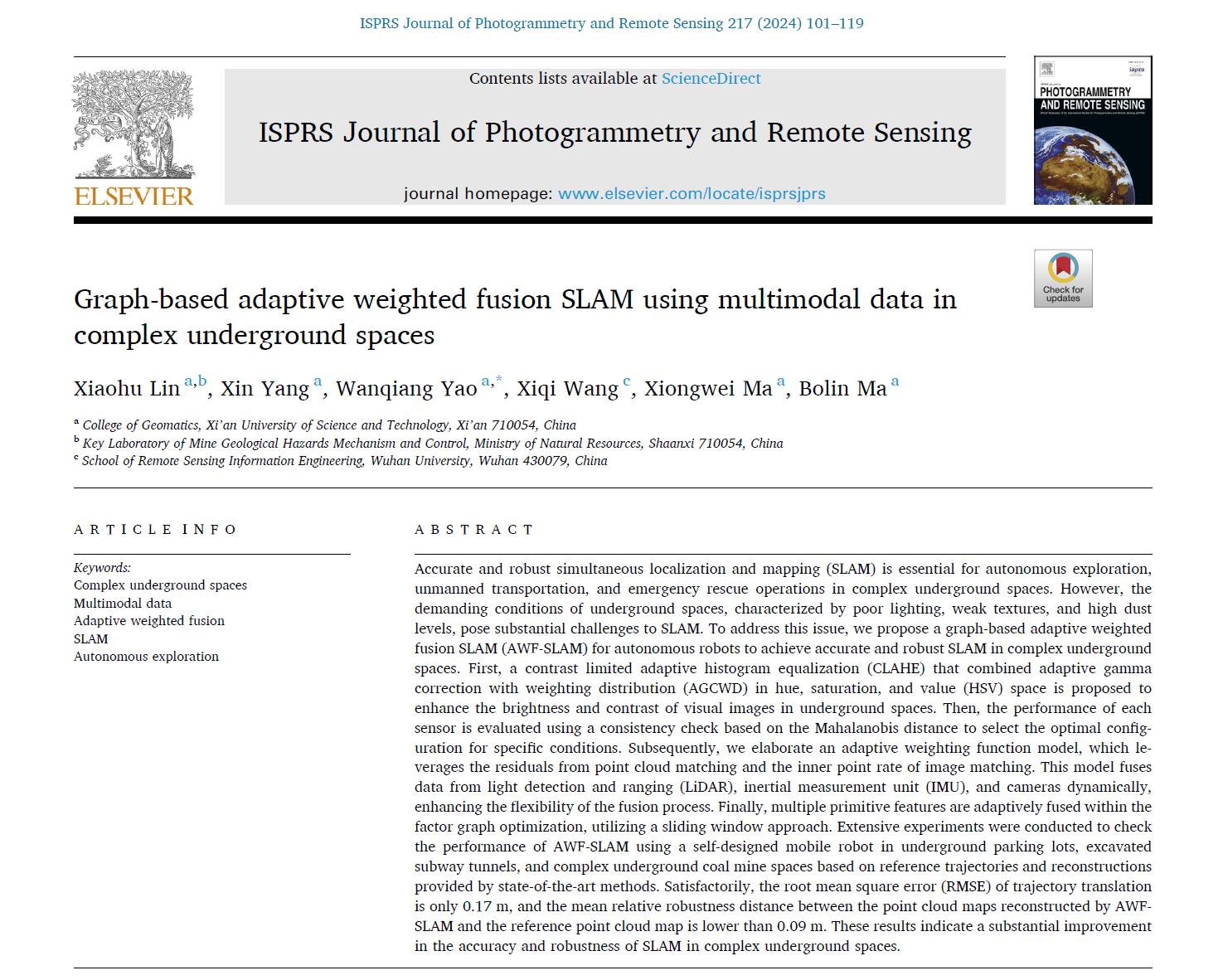 近日,云顶国际8588yd云顶国际8588yd矿山智能测绘研究团队在摄影测量与遥感领域国际顶级期刊ISPRS Journal of Photogrammetry and Remote Sensing(ISPRS P&RS)发表了题为“Graph-based adaptive weighted fusion SLAM using multimodal data in complex underground spaces”的研究成果,论文第一作者为蔺小虎副教授,第二作者为硕士研究生杨鑫,通讯作者为姚顽强教授。ISPRS P&RS期刊(中科院一区Top期刊,IF=10.6)被公认为是摄影测量与遥感领域最具权威性的国际期刊之一,主要发表摄影测量、遥感观测、空间信息系统、计算机视觉等领域的理论和方法相关的原创文章。