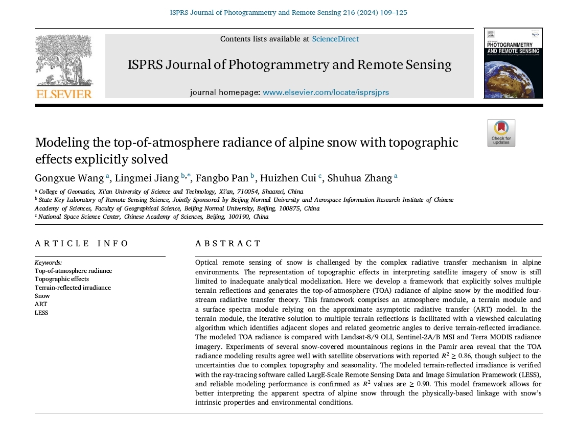 近日,云顶国际8588yd云顶国际8588yd矿区定量遥感研究团队在摄影测量与遥感领域国际顶级期刊ISPRS Journal of Photogrammetry and Remote Sensing(ISPRS P&RS)发表了题为“Modeling the top-of-atmosphere radiance of alpine snow with topographic effects explicitly solved”的研究成果,王功雪讲师为第一作者,张淑花副教授为共同作者。ISPRS P&RS期刊(中科院一区Top期刊,IF=10.6)被公认为是摄影测量与遥感领域最具权威性的国际期刊之一,主要发表摄影测量、遥感观测、空间信息系统、计算机视觉等领域的理论和方法相关的原创文章。
