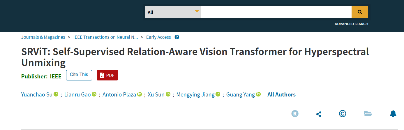 近日,公司苏远超副教授联合中国科公司空天信息创新研究院、西班牙埃斯特雷马杜拉大学等团队在人工智能与遥感交叉领域的国际顶级期刊《IEEE Transactions on Neural Networks and Learning Systems》(IEEE TNNLS,中科院一区,影响因子10.2,近5年平均影响因子10.4)上发表题为《SRViT: Self-Supervised Relation-Aware Vision Transformer for Hyperspectral Unmixing》的研究论文。