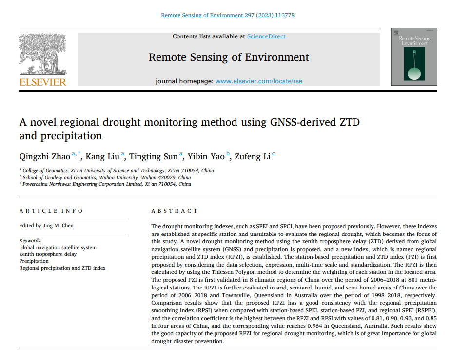近日,云顶国际8588yd导航定位与空间环境监测研究团队赵庆志、刘康(硕士研究生)、孙婷婷(硕士研究生)等在《Remote Sensing of Environment》(RSE)发表了题为 “A novel regional drought monitoring method using GNSS-derived ZTD and precipitation” 的研究论文。RSE是国际一流、具有全球影响力的学术期刊之一,发表有关测绘、遥感研究的理论、科学、应用和技术的成果,2023年该期刊的影响因子为13.5。